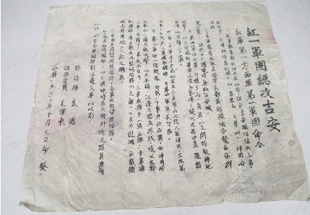 “红一军团总攻吉安命令”共七条,第一条指明“敌军邓英部兵力不在山前,仍在吉安城郊依托工事固守中”,第二条便是“本军团有攻取吉安、消灭邓英部队会合赣西南群众力量(之必要)决于4日拂晓前夺取吉安城”,短短两句便把敌军地点、出兵目的、战斗任务与时间讲得明明白白。后面五条则是给第四军、第三军及二十军划清行军路线、指挥权归属、作战范围及战后会师时间地点、联系方式等作出明确交代。最后签署为“总指挥朱德、政治委员毛泽东 公历一九三○年十月三日印发”,即总攻发起之前一日,说明当时战斗之重要紧迫,我军之军风已十分整肃威严。
