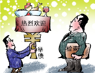 广东一镇政府欠债超千万,举债迎检查陪吃喝还送礼。 (陶小莫 画)