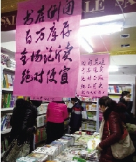 1月17日早上9时30分许,记者来到这家书店,发现来买书的客人络绎不绝。走进店里,写着“书店倒闭,百万库存,全场论斤卖,绝对便宜”的大红纸随处可见。
