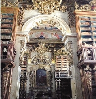 科英布拉市在12至13世纪时是葡萄牙的首都,境内的科英布拉大学是欧洲历史最悠久的大学之一,该大学的中央图书馆迄今已有700多年的历史,也是欧洲最古老的图书馆之一。图书馆属于典型的巴洛克式建筑,馆内装饰金碧辉煌,气魄宏大而典雅。屋顶有将近5米高,分为上下两层,房屋采用拱状结构。馆内屋顶用各式挂毯和瓷砖画装点,反映了宗教、战争和历史的主题。图书馆藏书10万余册,如今架上的图书只能作为展品,但可以在新馆找到相应的复写本阅读。