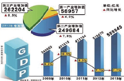 国家统计局数据显示,2013年中国国内生产总值为568845亿元,按可比价格计算比上年增长7.7%,比上年增加近5万亿元,这一增量就相当于1994年全年经济总量。