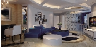 户型的中心是客厅,圆形的客厅沙发,弧形背景,板墙高斜面电视背景墙,整体呈现环抱形态,节省了部分空间,也让客厅的视野更开阔。为保证光线的穿透性,设计师还将圆形沙发旁边的空间设计成开放式休闲区,有效利用了空间。茶几形状选用圆形,更加适合家人团圆聚会,寓意合家美满。
