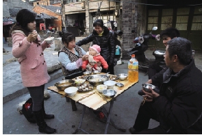| 来自四川的新居民一家在院子里吃年夜饭。 (通讯员 韩高树 )