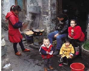 | 大年三十,来自四川的新居民在塘下的出租房门口准备年夜饭。 (通讯员 韩高树 )