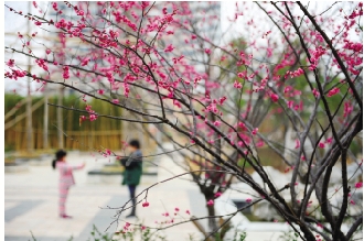 | 春暖花开早,塘下街心公园梅花怒放引来小朋友游玩拍照。 (见习记者 陈立波)