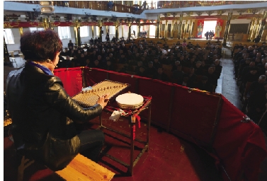 | 鲍田前池古戏台上鼓词唱响,村民在浓浓的文化氛围中过年。 (特约记者 刘峰)