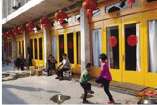 | 塘下南山村村民在家门口晒太阳,小孩们在玩爽。村民每年都在年前把房门重新上漆,鲜黄的房门和高高挂起的灯笼为新年增添喜气。 (通讯员 韩高树)
