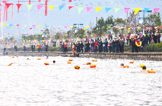 昨日适值“悬赏环保局长游泳”事件一周年,市冬泳协会江南分会50多名冬泳爱好者跳入仙降街道横街东河,亲身检验水质状况。(照片由市冬泳协会提供)
