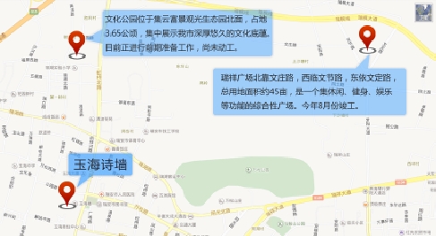 “不过,我们可以考虑将‘玉海诗墙’迁入将要开工的文化公园中,而且诗墙内容正好符合公园主题。”据陈忠汉介绍,文化公园是我市即将建设的一个专类公园,已经列入《瑞安市城市绿地系统规划(2012-2020)》。该公园占地3.65公顷,位于集云富景观光生态园北面,西靠锦湖北路,东依虹桥北路,将集中展示我市深厚悠久的文化底蕴。目前,该公园还在前期准备工作,尚未动工。