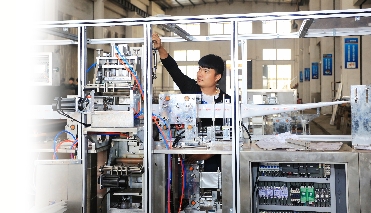走进大伟机械公司厂房,映入眼帘的是一台锃亮的包装机械,工人们正在忙着调试。营销总监柯雄伟从一台包装机前起身迎接我们:“刚刚下的订单呢,这两台面膜机明天就要发往山东。”