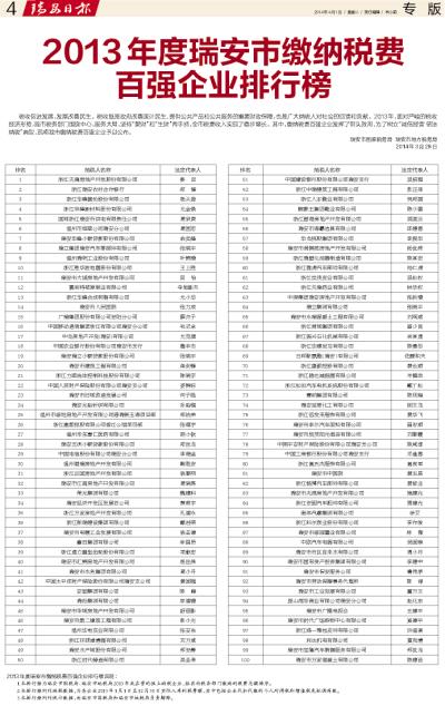 2013年度瑞安市缴纳税费百强企业排行榜