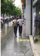 “这家店门有两道玻璃门,可以向内或者向外打开,如果向内开对路人没什么影响,如果向外开就成一道无形的路障了。”@空中的梦想家2046 说,“因为玻璃门边缘没有任何明显的标识,我特意在所拍的照片中用红色的虚线标注出玻璃门向人行道开的位置。目测门突出人行道约40厘米,如果行人路过不注意的话,很容易会碰到手臂,注意力不集中的话,还可能碰到头。”
