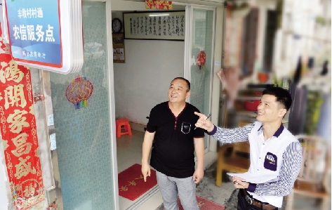 尤龙(右)在卓岙村党支部书记叶其锡家门口农信服务点现场