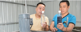 程学波(左)与杨昌武拿着经过处理的水和印花废水做对比