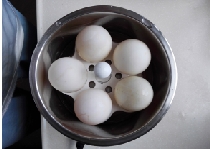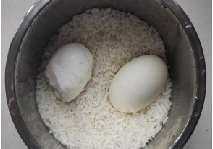 实验步骤:煮饭时,记者将两个咸鸭蛋一个去壳,另一个不去壳同时放进电饭锅里一起煮。