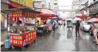 即使下大雨,仍有一些摊位占道经营