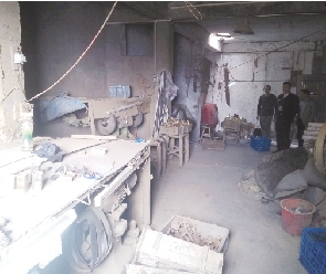 西岙村一抛光作坊内布满了灰尘,安监员林永利等人检查了该作坊的通风除尘设备,发现这些设备周围也布满了粉尘。