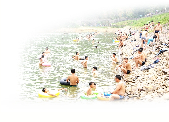 记者往前走,只见一道近200米的堤坝上站满了人:站着闲聊的,晒头发的,看别人游泳,呐喊加油的皆有。“快点,超越他,加油。”记者循声望去,水库里竟有一两百个人头攒动,有三五成群比赛游泳的,有独自一人的,光着膀子的男人,穿着泳衣的女人,带着泳圈的小孩,还有一些女孩子们在充气艇上划着,偶尔有人打起水仗,她们便尖叫着躲开,引得充气艇一阵晃动。