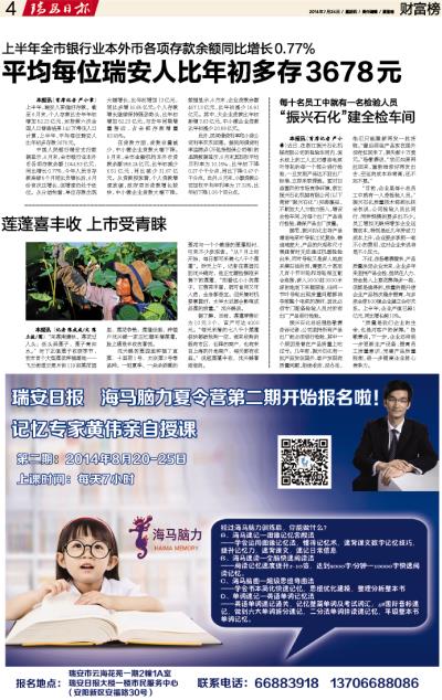 平均每位瑞安人比年初多存3678元