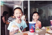 在附近的肯德基快餐店里,“小候鸟”们整齐地坐好用餐。一个汉堡、一份薯条、一杯可乐,简单的午餐和愉快的交谈,让“小候鸟”们度过了温馨的午间时间。