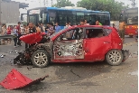 民警到达现场后发现,红色肇事车辆驾驶员谢某已被送往市人民医院接受治疗,而该辆红色肇事车的车头、车尾都有严重的撞击痕迹,车内安全气囊全部弹出,周围都是车辆碎片的散落物,车辆基本被撞散架。在肇事车左前方,一辆红色厢式大货车左车角保险杆位置被撞坏了;而在肇事车的后方,一辆油罐车的车身中后部被撞凹陷了一大块,所幸现场无人员伤亡。