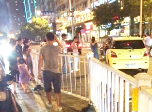 前晚,万松东路市府路段发生了一起交通事故,一辆黄色小轿车突然撞向道路中间栏杆,随后,车上先后下来两男一女,而先下来的两名男子拿着一单肩包很快消失在夜色中,女子则向一好心人借来手机,报了警。