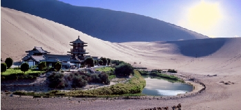 还有一个奇特现象特别值得一提,因为地势的关系,刮风时沙子不会往山下走,而是从山下往山上流动,所以月牙泉永远不会被沙子埋没,这一现象堪称沙漠奇观。这里的8月,泉边树木葱茏,俨然沙漠绿洲!