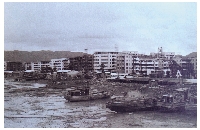 从管陶1985年所拍的一张黑白老照片中可以看出,瑞安外滩大厦钟楼的位置原来只有一些零星的茅屋,后面的望江小区、滨江新村等小区都还未成形。沿江再往东看则全部是泥堤和荒地,垃圾满地,这块土地又是洪水恶浪肆虐的生命缺口。