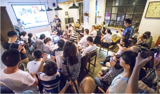当晚19时30分,讲座正式开始,此时的栖云里三楼已经人头攒动。记者粗略数数,小小的空间里,挤了50多位摄影爱好者,工作人员之前安排的座位,已经满足不了爱好者们的需求了,大家有的挤在一张椅子上,有的就直接站着听完整场讲座。