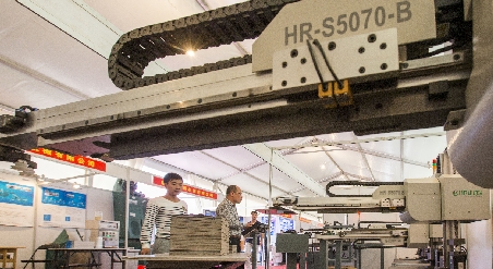 在公司展厅,工作人员当场演示了“冲压单臂机器人”的操作。记者看到,工作人员只需在操作板上设置好,这台机器人就能自动抓取,适用于各种非标准模具,可在冲床平台任意角度开展工作。