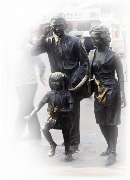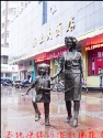 2005年5月,在市区万松路五洲超市前,即鑫业大厦前的繁华地带,多了一处别样的风景,这是一组城市小品类铜像“一家三口”:“爸爸”拿着手机边走边打电话,“妈妈”背着包笑意吟吟地将手搭在“女儿”肩上,似跟“女儿”说着什么,而梳着两根小辫子的“女儿”则欢乐地蹦跳着……