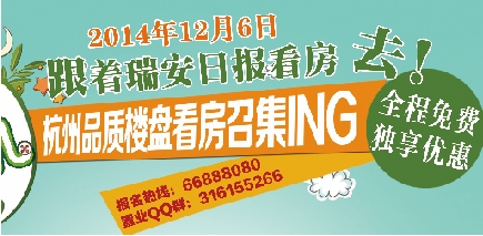 具体看房行程将安排在12月6日(下周六)出发,共两天,由瑞安日报提供免费大巴车和食宿,每位参与看房团的市民需缴纳押金300元。活动报名截至12月4日,看房团报名热线:0577—66888080。