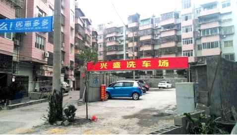 昨日,记者来到兴达路,在15栋附近找到了该洗车场。洗车场是露天的,没有搭建顶棚,其门口上方悬挂着红底黄字的“兴盛洗车场”广告牌。在这里已经看不到绿化带的痕迹,据记者观察,洗车场整个占地面积达数百平方米。