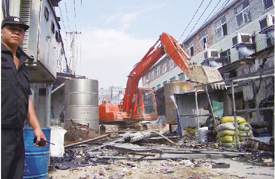 去年10月31日上午,在温州及我市消防部门的支持下,仙降街道组织安监、住建、国土、电力等部门150多人开展联合行动,集中拆除位于横街工业区的40多家鞋企的违章建筑共3000多平方米。在“轰隆隆”的声音中,一处处占据消防通道的违章建筑被拆除。