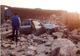 被压小车左侧车身几乎被石块掩埋,尤其是后备箱位置被压成纸片状,车体严重变形,几乎报废。工程车的前窗玻璃完全碎裂,车身右侧受损,而路边的多段护栏也被撞歪,现场一片狼藉。