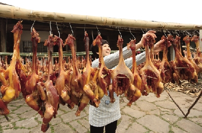 当然在这之前,鸡首先要在陆奶奶亲手调配的香料中待上几个小时,让各种香料充分渗入到它的每个毛孔,然后再上架,接受风和阳光的洗礼。