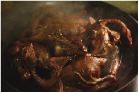 烟熏是一个十分美妙的过程。开始是,各种烟熏食材在铁锅的高温下,开始散发出浓烟,鸡在经受高温的烤制后,鸡油开始渗出,滴到红糖和糯米等食材上,产生二次反应,散发出独特香味的烟开始在锅内不断地进行循环,鸡则充分享受这美妙的时刻。过了半个多小时的烟熏,鸡的全身已经变成赤红色。