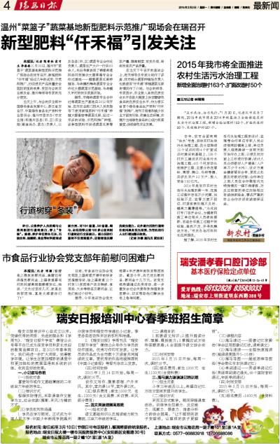 本报讯(记者 陈希林 实习生 李姿姿)1月30日,温州市“菜篮子”蔬菜基地新型肥料示范推广现场会在我市召开,新型肥料“仟禾福”经过几年的试用、示范和推广,对促进农产品质量安全起到明显的效果,受到与会的农业部及省、温州等领导专家的充分肯定。