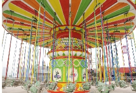 张国仁:游乐园占地5000多平方米,里面一共有14项游乐项目,有摇头飞椅、海盗船、碰碰车、喷球车、金龙滑车、豪华转马、溜冰场、摩天轮、迷你穿梭、鲨鱼岛、太空漫步、自控飞机、海豹戏水和恐怖城。