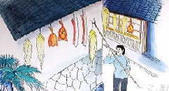 进入腊月,我家里开始晒酱油肉和鳗鱼鲞。打几斤猪肉,宰了自家养的几只鸡、鸭,放在酱油中浸泡,然后挂在屋外晾。当时,每家屋檐椽上密密麻麻地扎满铁钉,上面挂着酱油肉、酱油鸭、酱油鸡。年幼的儿子会不时抬头打量着,口水都流出来了。