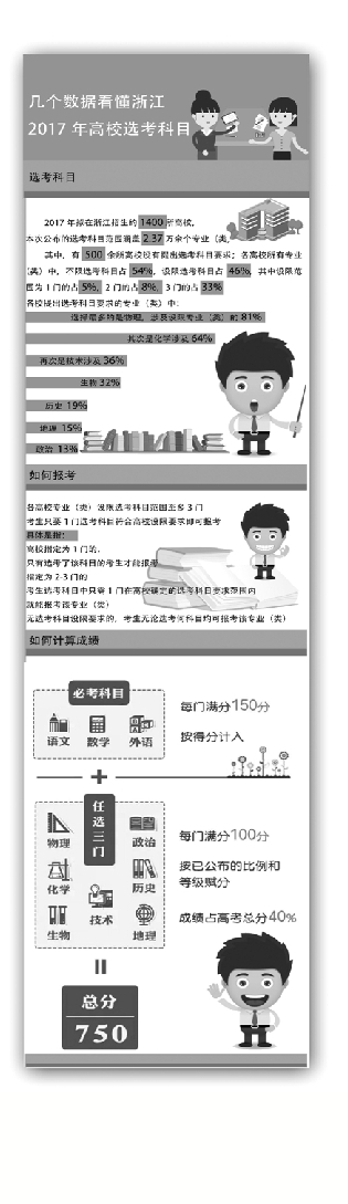 根据去年9月公布的《浙江省高考招生制度综合改革试点方案》,从2017年起,我省高考将采取“3+3”模式,除了必考的语数外,考生需从思想政治、历史、地理、物理、化学、生物、技术7门高中学考科目中自主选择3门参加等级性考试,成绩计入高考总分。按已公布的比例和等级赋分,每门满分100分,选考科目成绩占高考总分40%。
