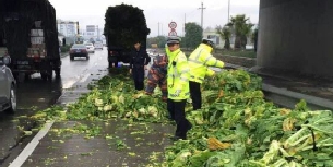 本报讯(记者 陈瑞建 通讯员 陈伶俐)3月3日15时20分许,在56省道黄垟村路口,一辆满载蔬菜的货车因未对蔬菜进行捆扎,致使大量的蔬菜在运输途中散落在地,占据飞云往马屿方向的一个车道。正在56省道巡逻的交警飞云中队副中队长吴建珊发现此事后,立马下车帮忙搬运蔬菜,并用对讲机呼叫在火车站路口执勤的同事前来帮忙。