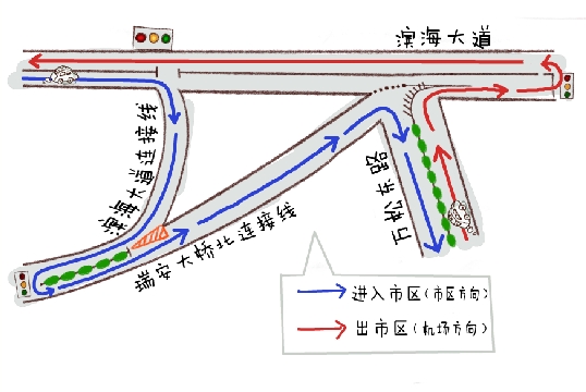 那么,今后市区往返滨海大道都要这样绕一大圈吗?滨海新区管委会地政拆迁局局长林孝海告诉记者,万松东路与滨海大道交叉口的渠化工程完成后,将打通市区往返机场的最后一段路,方便市民出行。