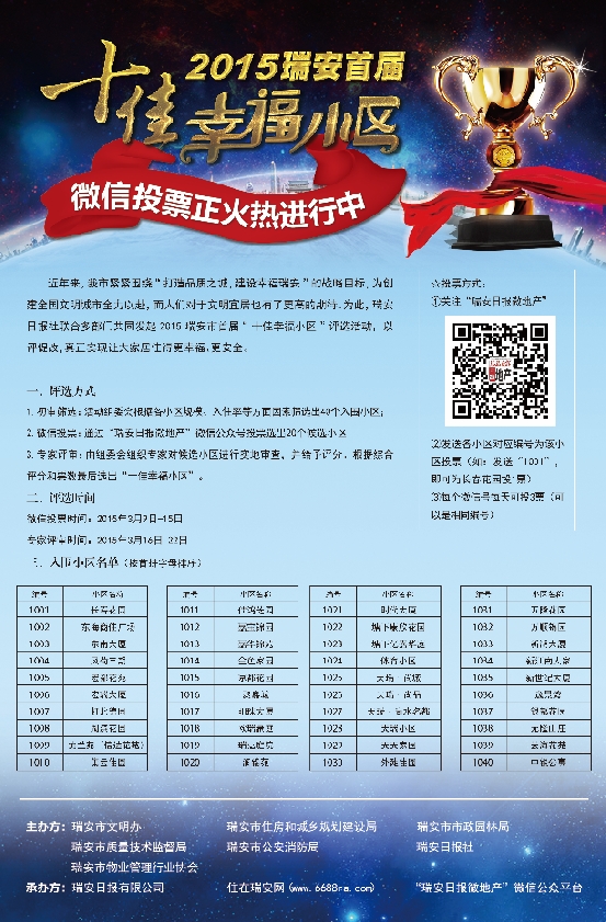 社址:浙江省瑞安市安阳新区安福路30号 邮编:325200 电话:(0577) 总编办:65816333 发行部:65836178 广告部:65917777 广告经营许可证:3303254000002全年订价:198元 印刷:温州浙报文化印务有限公司 发行方式:自办发行