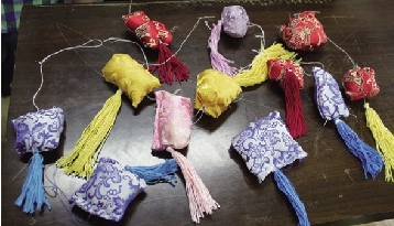 香囊缝好后,要用五彩线——红、黄、蓝、白、黑做挂绳。五彩线,象征五行,有防瘟驱邪功能。香囊由女当家人分给每个孩童一对,可以挂在脖颈上,也可以拴在手腕上。拿去嗅香、比秀、玩耍取乐。缝香囊的本意为投江而亡的诗人屈原护躯防腐、拒邪恶近身、避毒虫叮咬。后来演变成女子针线工艺比赛的一种家庭活动。
