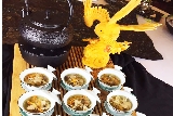 这是一道极花时间慢慢煲出来的菜,要想做好这道菜,首先得花10来个小时准备汤底,用鸡肉、排骨蒸10多个小时,蒸出汤汁。再准备松茸、虫草花、白玉菇、海蜇血、天籽兰花,然后在这些食材中加入准备好的汤汁,再蒸上半个多小时,就可食用了。这是一道不用加味精,味道鲜美的养生菜。