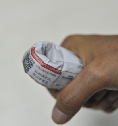 步骤三:左手握紧啤酒瓶的瓶颈,右手将对折好的报纸抵住啤酒瓶盖矩形齿角边,以左手食指关节为指点,迅速用力。