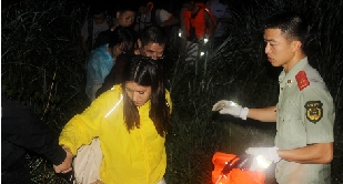救援人员只能在伸手不见五指的深山中,通过微弱的手电筒灯光,沿着溪水下游方向,在荆棘丛中艰难曲折前进。