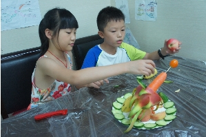 这是要干嘛?原来今天是活动课,我们被分为六个小组,比赛做水果拼盘。虽然我们组人的年纪最小,可是人数却最多,俗话说:人多力量大嘛!我们几个“臭皮匠”开始辛苦工作,对“各路”水果进行了大刀阔斧的改造。