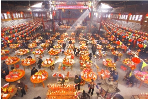 每年殿会,村民们都怀着一颗虔诚的心,一早做好准备。为了表示诚心,村民们还会特地留出一亩地,该地产出的大米专门用来做殿会的年糕、斛食等祭祀食物。“村民用河泥种植水稻,用河水灌溉,肥料则用菜籽油渣代替牲畜粪便。”董海寅说,殿会前三天,村里还会举行“敬河水”的活动,敲锣打鼓提醒村民不能在河里刷马桶、洗衣裤。此外,全村还要吃素三天。